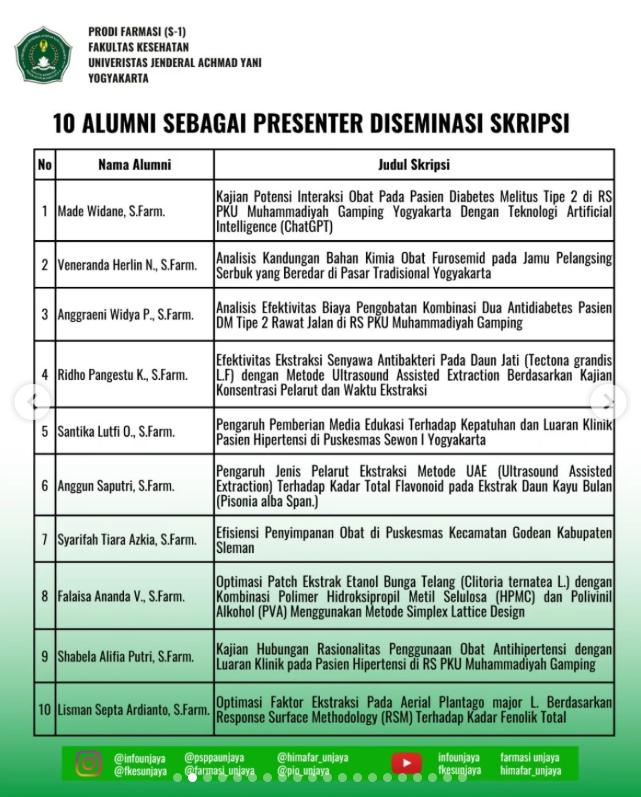 Program Studi Farmasi (S-1) Fakultas Kesehatan Universitas Jenderal Achmad Yani Yogyakarta menyelenggarakan kegiatan Diseminasi Skripsi oleh 10 Alumni sebagai bentuk publikasi ilmiah dan berbagi hasil penelitian kepada sivitas akademika. Kegiatan ini menjadi salah satu upaya prodi dalam mendorong budaya akademik, peningkatan kualitas riset mahasiswa, serta pemanfaatan hasil penelitian di bidang kefarmasian.