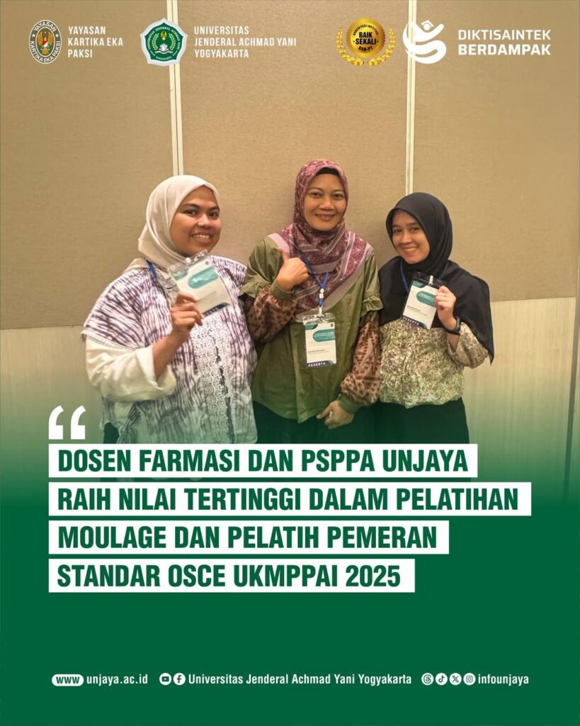 Tiga dosen dari Program Studi Farmasi (S-1) dan Program Studi Pendidikan Profesi Apoteker (PSPPA) Universitas Jenderal Achmad Yani Yogyakarta (UNJAYA) kembali menorehkan prestasi membanggakan dalam upaya peningkatan mutu pendidikan kefarmasian. Ketiga dosen tersebut, apt. Mardiana Puji Lestari, M.Farm., apt. Nanda Tsalasani Zulfaidah, M.Pharm.Sci., dan apt. Novia Ariani Dewi, M.Clin.Pharm., berhasil meraih nilai tertinggi dalam Pelatihan Moulage dan Pelatih Pemeran Standar OSCE (Objective Structured Clinical Examination) yang diselenggarakan secara nasional oleh Panitia Nasional Ujian Kompetensi Mahasiswa Pendidikan Profesi Apoteker Indonesia (PN UKMPPAI) Tahun 2025.