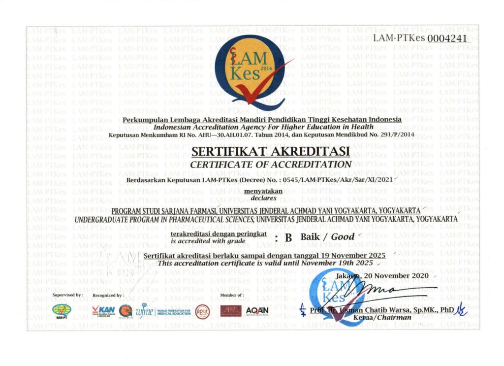 Program Studi Farmasi (S-1) Fakultas Kesehatan Universitas Jenderal Achmad Yani Yogyakarta berdiri berdasarkan Keputusan Menteri Pendidikan Nasional Nomor 50 Tahun 2015 dan SK Kementrian Riset, Teknologi dan Pendidikan Tinggi No 177/KPT/I/2016 tanggal 11 Mei 2016. Prodi Farmasi Unjaya memulai operasional pembelajaran pada Tahun Akademik 2017/2018 dan telah memperoleh akreditasi “B” dari LAM-PTKes dengan Skep Nomor 0545/LAM-PTKes/Akr/Sar/XI/2021. Prodi Farmasi Unjaya berkomitmen untuk terus meningkatkan mutu menuju Akreditasi Unggul.