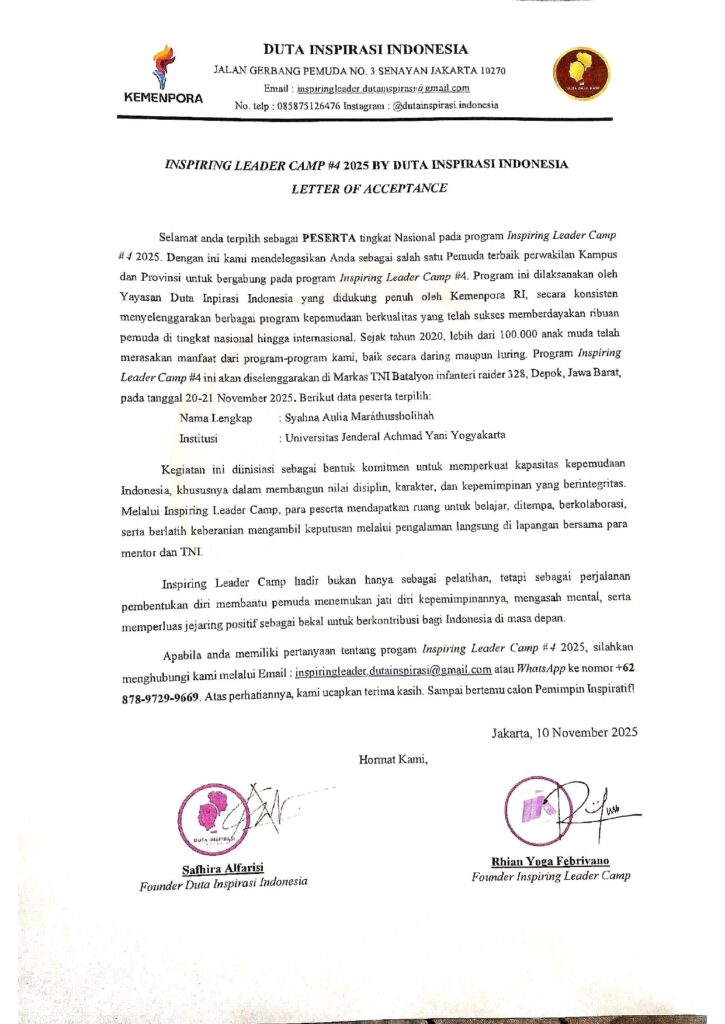 Syahna Aulia Mar’athussholihah (NIM 232207030), mahasiswa Semester 5 Reguler Program Studi S1 Kebidanan, terpilih sebagai peserta tingkat nasional dalam program Inspiring Leader Camp #4 Tahun 2025 yang diselenggarakan oleh Yayasan Duta Inspirasi Indonesia dengan dukungan penuh Kementerian Pemuda dan Olahraga Republik Indonesia (KEMENPORA RI). Kegiatan ini dilaksanakan pada 20–21 Desember 2025 di Markas TNI Batalyon Infanteri Raider 328, Depok, Jawa Barat, dengan melibatkan pemuda-pemudi terbaik sebagai perwakilan kampus dan provinsi dari seluruh Indonesia.
