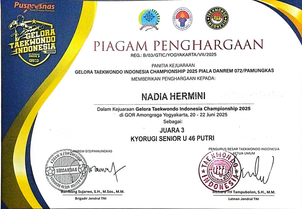 Nadia Hermini (NIM 232207031), mahasiswi Semester 4 Program Studi S1 Kebidanan Reguler, berhasil menorehkan prestasi nonakademik dengan meraih Juara 3 Lomba Kyorugi U-46 pada ajang Gelora Taekwondo Indonesia Championship 2025 Piala Danrem 072/Pamungkas. Kejuaraan ini diselenggarakan di Yogyakarta pada 20–22 Juni 2025 dan diikuti oleh atlet taekwondo dari berbagai daerah. Prestasi tersebut diraih melalui disiplin latihan, ketangguhan fisik, serta semangat juang yang tinggi dalam setiap pertandingan.