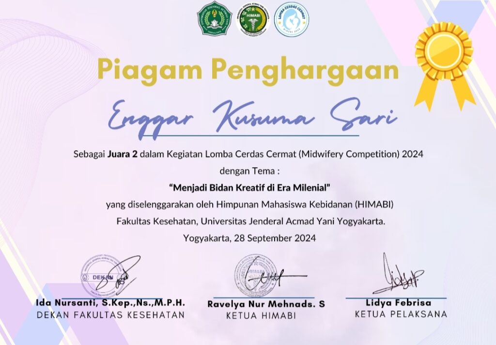 Enggar Kusuma Sari (NIM 232207048), mahasiswa Semester 3 Reguler, menorehkan prestasi akademik dengan meraih Juara 2 Lomba Cerdas Cermat (Midwifery Competition) 2024 bertema “Menjadi Bidan Kreatif di Era Milenial” yang diselenggarakan oleh Himpunan Mahasiswa Kebidanan (HIMABI) Fakultas Kesehatan Universitas Jenderal Achmad Yani Yogyakarta pada 28 September 2024 di Yogyakarta. Capaian ini diraih melalui kemampuan analisis yang baik, penguasaan keilmuan kebidanan, serta kolaborasi tim yang solid, yang mencerminkan proses pembelajaran yang terarah dan adaptif terhadap perkembangan ilmu dan teknologi.