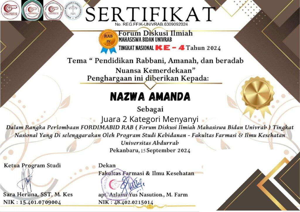 Semangat dan bakat mahasiswa kembali membuahkan prestasi membanggakan melalui Nazwa Amanda (NIM 232207027), mahasiswi Semester 3 Program Studi S1 Kebidanan Reguler, yang berhasil meraih Juara 2 Lomba Menyanyi Tingkat Nasional dalam ajang FORDIMABID RAB (Forum Diskusi Ilmiah Mahasiswa Bidan Univrab). Perlombaan yang digelar secara daring pada 15 September 2024 ini diikuti oleh mahasiswa dari berbagai perguruan tinggi di seluruh Indonesia dan menjadi ruang ekspresi kreativitas serta pengembangan diri di luar bidang akademik.