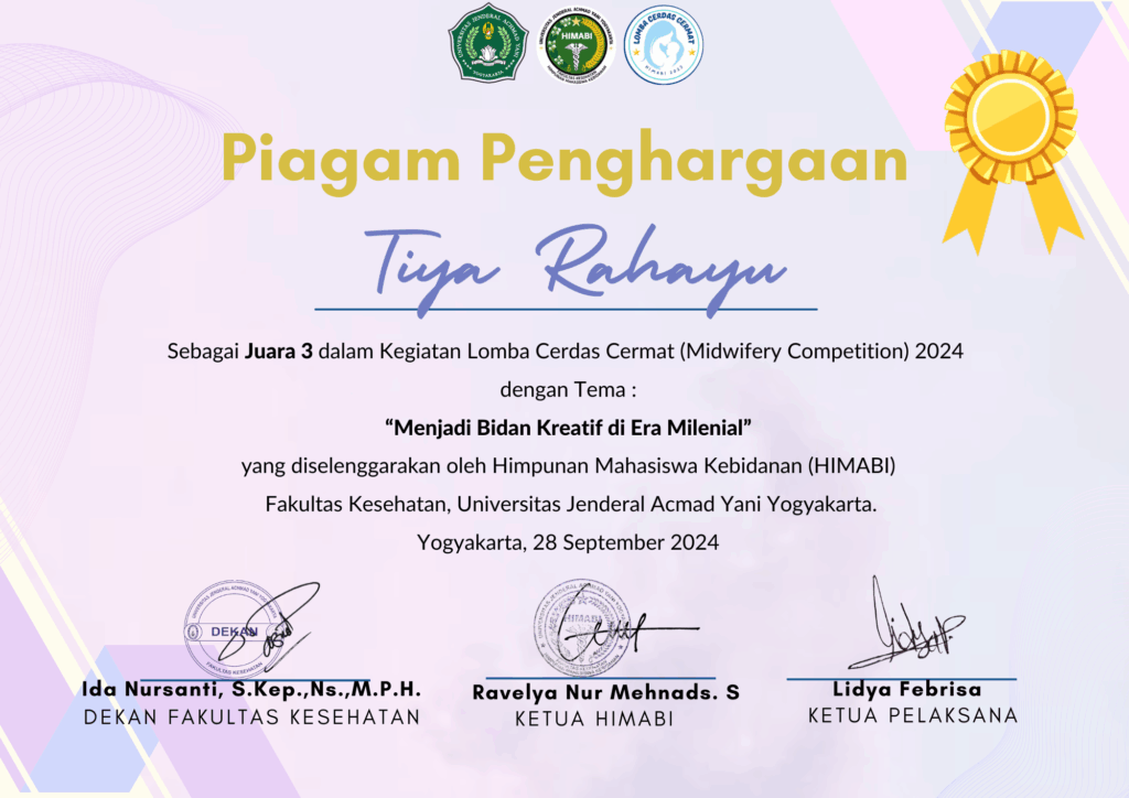 Prestasi membanggakan juga ditorehkan mahasiswa Program Studi Kebidanan. Tiya Rahayu (NIM 232207002), mahasiswi Semester 3 Reguler, berhasil meraih Juara 3 Lomba Cerdas Cermat (Midwifery Competition) 2024 yang diselenggarakan oleh Himpunan Mahasiswa Kebidanan (HIMABI) Fakultas Kesehatan Universitas Jenderal Achmad Yani Yogyakarta. Kompetisi bergengsi ini berlangsung pada 28 September 2024 di Yogyakarta, mempertemukan mahasiswa kebidanan terbaik dari berbagai perguruan tinggi se-Indonesia. Pencapaian Tiya bukan sekadar keberuntungan. Di balik medali perunggu yang diraihnya, terdapat ketekunan belajar, penguasaan mendalam terhadap dasar-dasar keilmuan kebidanan, serta kemampuan berpikir kritis yang terasah dalam menjawab berbagai pertanyaan menantang selama kompetisi.