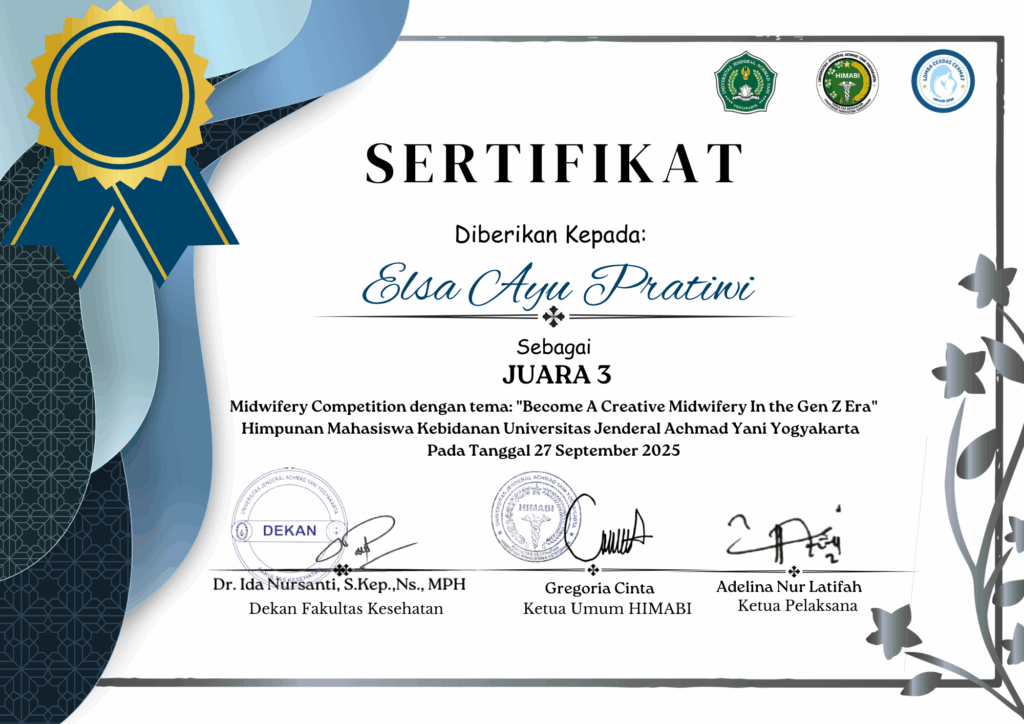 Elsa Ayu Pratiwi, mahasiswi Semester 3 Program Studi Kebidanan Unjaya, membuktikan bahwa talenta muda kampus mampu bersinar sejak awal perkuliahan dengan meraih Juara 3 Lomba Midwifery Competition bertema “Become A Creative Midwifery In The Gen Z Era” yang diselenggarakan di Kampus Unjaya Yogyakarta pada 27 September 2025. Kompetisi yang mengangkat tema relevan tentang kreativitas bidan di era Generasi Z ini menguji kemampuan mahasiswa dalam berinovasi, beradaptasi dengan teknologi kesehatan digital, serta memahami pendekatan kebidanan yang sesuai dengan karakteristik pasien generasi muda.