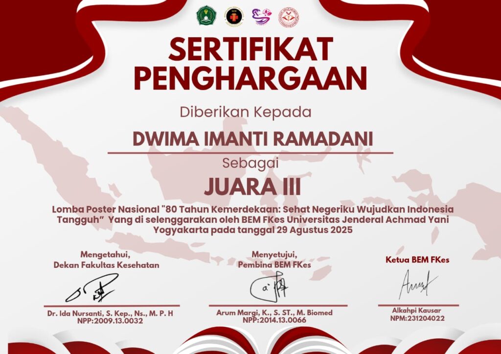 Dwima Imanti Ramadani (NIM 232207062), mahasiswi Semester 5 Program Studi S-1 Kebidanan Reguler, berhasil meraih Juara 3 Lomba Poster yang diselenggarakan oleh BEM Fakultas Kesehatan (FKES) Universitas Jenderal Achmad Yani Yogyakarta (UNJAYA). Perlombaan ini dilaksanakan di Yogyakarta pada 29 Agustus 2025 dan diikuti oleh mahasiswa dari berbagai program studi. Prestasi tersebut diraih melalui kreativitas visual, ketepatan penyampaian pesan, serta kemampuan menuangkan gagasan edukatif dalam bentuk poster yang komunikatif. Capaian ini mencerminkan peran aktif mahasiswa dalam mengembangkan potensi akademik dan nonakademik, sekaligus menunjukkan dukungan program studi dalam membina mahasiswa yang inovatif, berdaya saing, dan berkontribusi positif bagi lingkungan akademik.